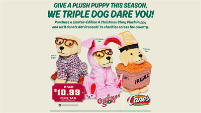 The star of the show and back by popular demand are Cane’s three limited-edition holiday Plush Puppies, each inspired by iconic A Christmas Story moments. Available November 19 through December 31. Available for purchase in-Restaurant for $10.99 plus tax. These adorable collectors' items will sell out fast!